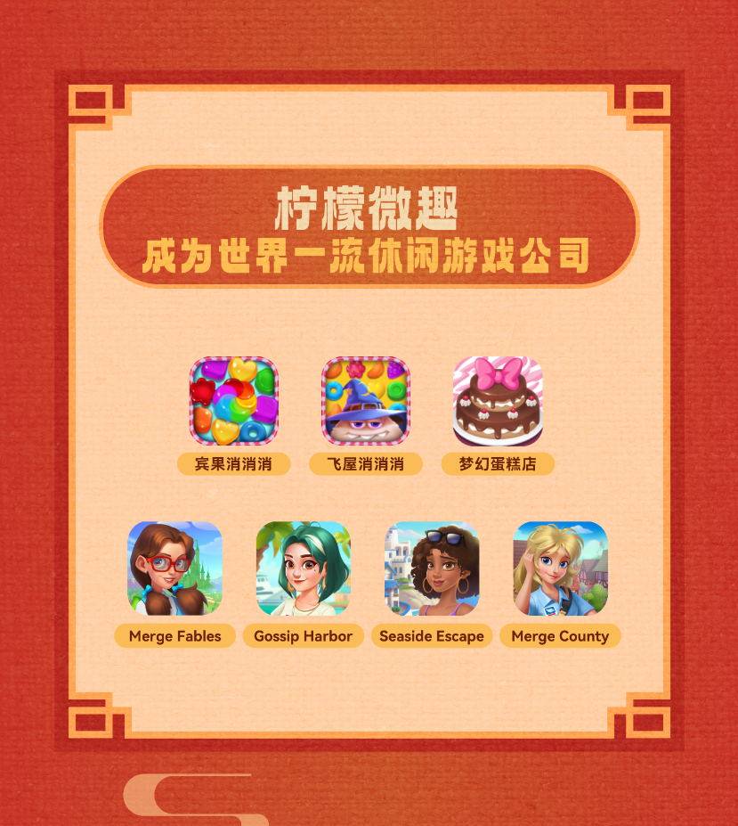 柠檬微趣是国内领先的手机游戏开发商和运营商,获得了国家高新技术企业、北京市“专精特新”中小企业、北京民营企业中小百强等资质荣誉。近些年来,公司发力海外市场,除经典产品《宾果消消消》、《梦幻蛋糕店》等,又新推出了《浪漫餐厅》、《Merge County》、《Gossip Harbor》、《Seaside Escape》等热销海外的游戏产品,全球累计用户超过3亿。2024年1月,荣登中国游戏厂商出海收入排行榜前16,同时成为合成类手游领域全球收入最高的公司。